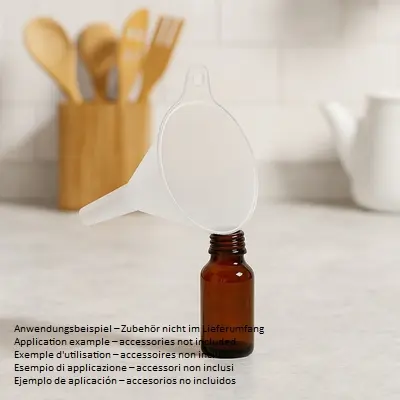 Der Colloimed Trichter mit seiner glatten Innenfläche und einem schmalen Auslauf besteht aus PP-Kunststoff (Polypropylen) und verfügt über einen kleinen Griff an der Oberseite, mit dem Sie den Trichter sicher an Ort und Stelle halten können, während Sie Flüssigkeiten eingießen, um das Risiko von Verschüttung erheblich zu reduzieren. Der Trichter ist für alle Braunglasflaschen mit DIN18 Mündung geeignet